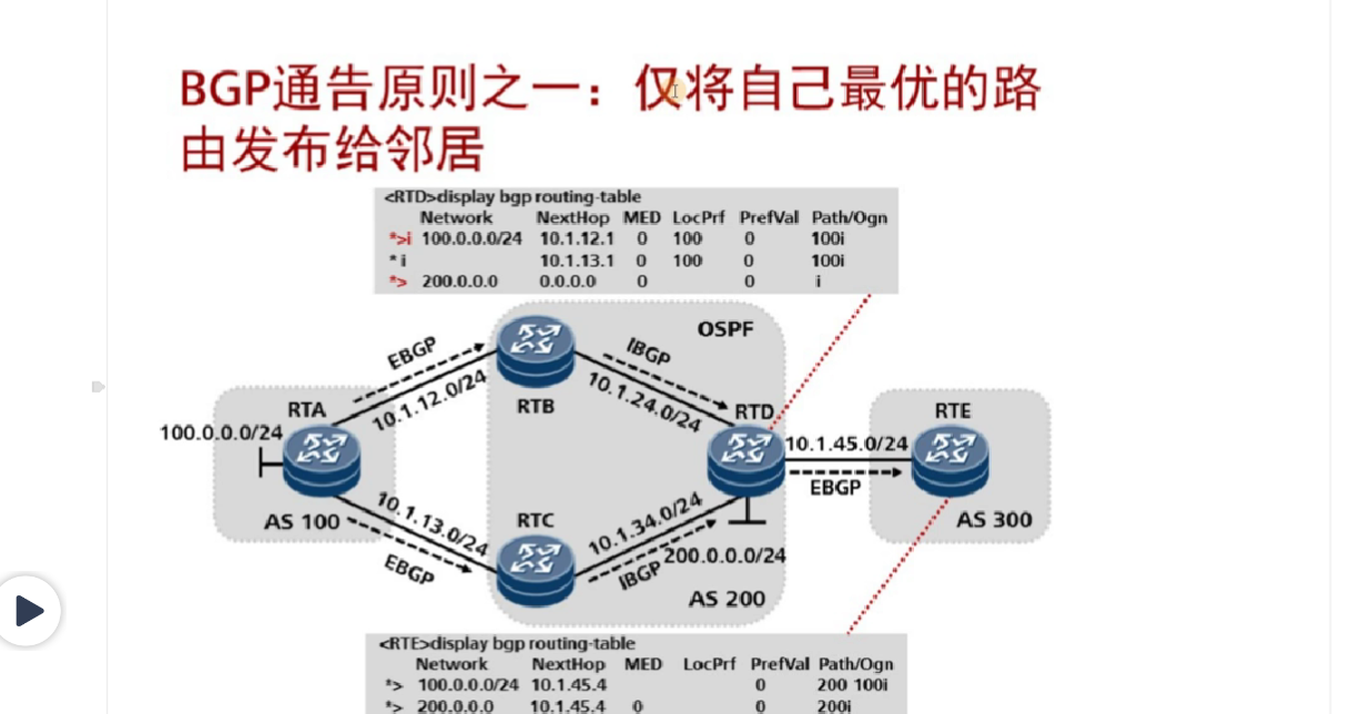 2、BGP只将最优 的 * 及 有效的 >路由, 并且需要下一跳可达 才 会放进IGP 路由表