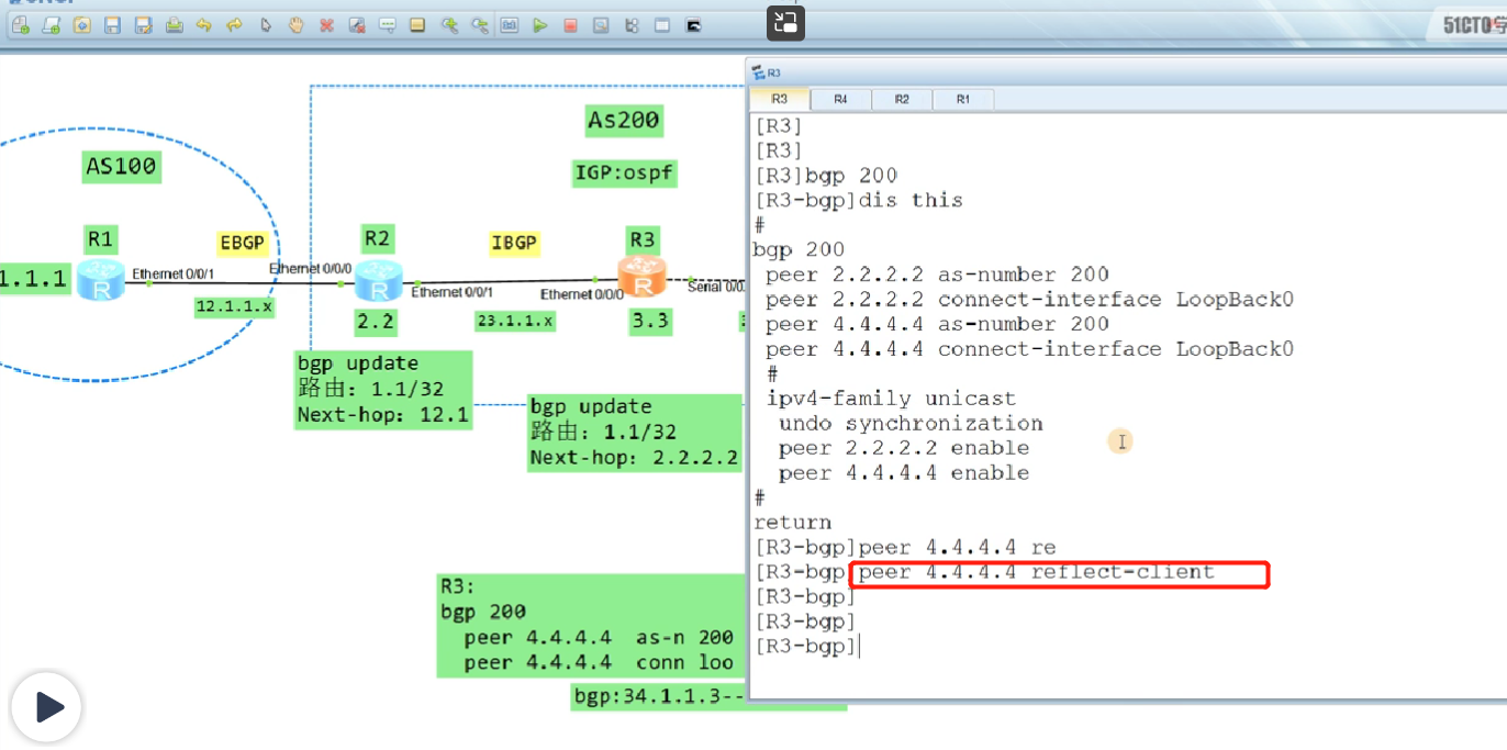 配置R4作为 R3的路由反射器客户端,一条命令即可,R4上不需要配置