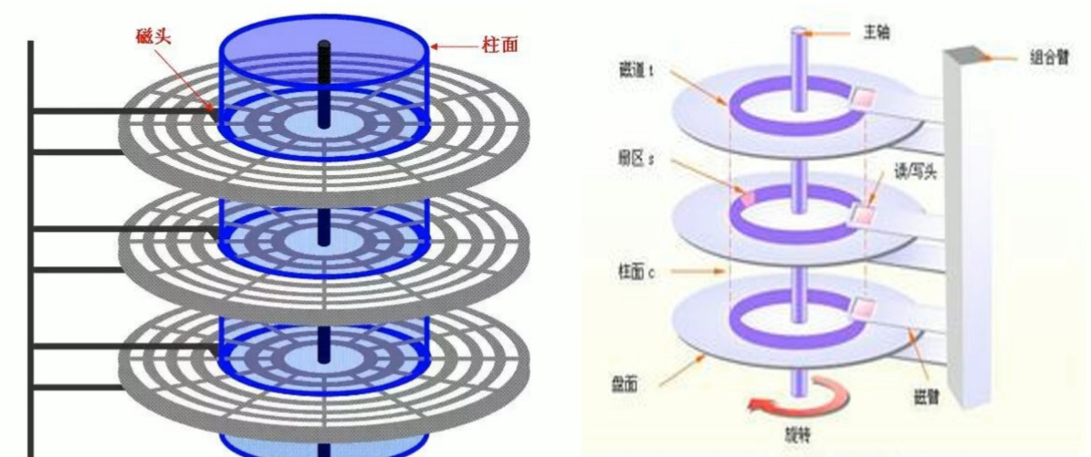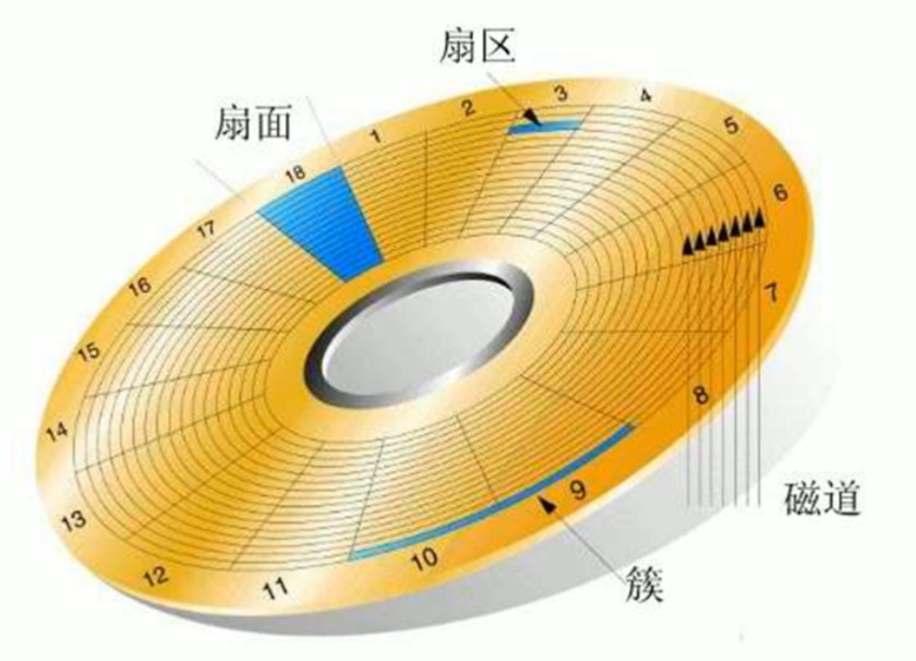 head:磁头 磁头数=盘面数 track:磁道 磁道=柱面数 sector:扇区,512bytes cylinder:柱面 1柱面=512 * sector数/track*head数=512*63*255=7.84M