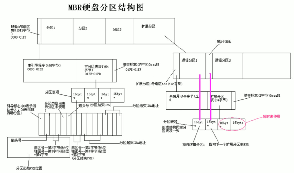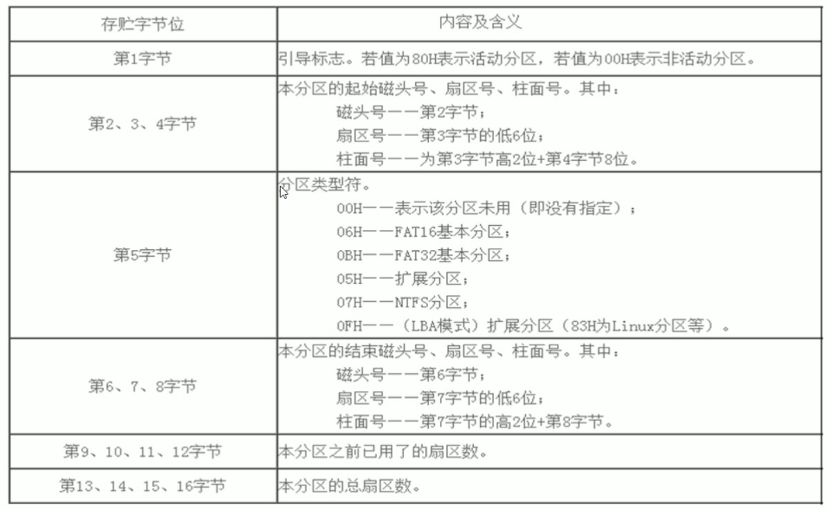 3).分区表(DPT,Disk Partition Table)含4个分区项,偏移地址01BEH--01FDH,每个分区表项长16个字节,共64字节为分区项1、分区项2、分区项3、分区项4