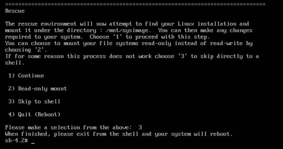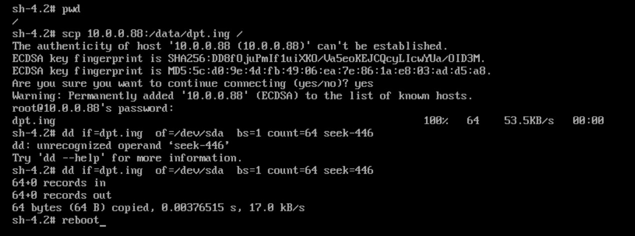 [root@centos7 ~]# dd if=/dev/sda of=/data/dpt.ing bs=1 count=64 skip=446 64+0 records in 64+0 records out 64 bytes (64 B) copied, 0.00037933 s, 169 kB/s [root@centos7 ~]# ll /data/dpt.ing -rw-r--r-- 1 root root 64 Jan 6 06:14 /data/dpt.ing [root@centos7 ~]# file !* file /data/dpt.ing /data/dpt.ing: 8086 relocatable (Microsoft) [root@centos7 ~]# file /data/dpt.ing /data/dpt.ing: 8086 relocatable (Microsoft) [root@centos7 ~]# hexdump -C /data/dpt.ing 00000000 80 20 21 00 83 aa 28 82 00 08 00 00 00 00 20 00 |. !...(....... .| 00000010 00 aa 29 82 83 fe ff ff 00 08 20 00 00 00 80 0c |..)....... .....| 00000020 00 fe ff ff 82 fe ff ff 00 08 a0 0c 00 00 80 00 |................| 00000030 00 fe ff ff 05 fe ff ff 00 08 20 0d 00 f8 df 0b |.......... .....| 00000040 [root@centos7 ~]# scp /data/dpt.ing 10.0.0.88:/data The authenticity of host '10.0.0.88 (10.0.0.88)' can't be established. ECDSA key fingerprint is SHA256:DD8fOjuPmIf1uiXKO/Va5eoKEJCQcyLIcwYUa/OID3M. ECDSA key fingerprint is MD5:5c:d0:9e:4d:fb:49:06:ea:7e:86:1a:e8:03:ad:d5:a8. Are you sure you want to continue connecting (yes/no)? yes Warning: Permanently added '10.0.0.88' (ECDSA) to the list of known hosts. root@10.0.0.88's password: dpt.ing 100% 64 8.8KB/s 00:00 [root@centos7 ~]# dd if=/dev/zero of=/dev/sda bs=1 count=64 seek=446 # 用光盘启动,进入rescue mode,选第3项skip to shell # 配置网络 # ifconfig ens33 10.0.0.7/24 # scp 10.0.0.88:/root/dpt.ing # 恢复MBR分区表 # dd if=dpt.img of=/dev/sda bs=1 seek=446 # reboot