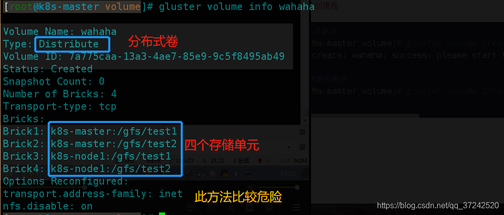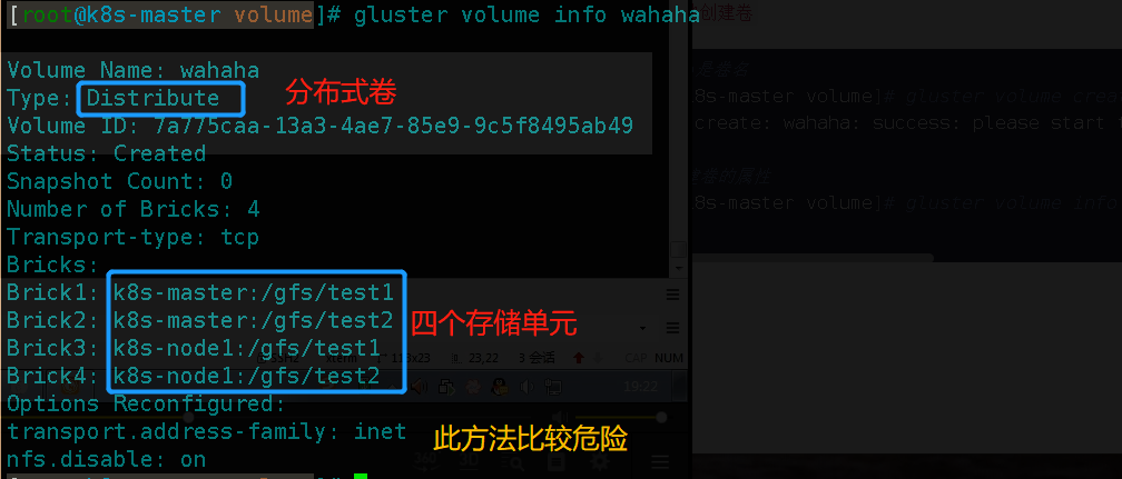 [root@k8s-master volume]# gluster volume create wahaha k8s-master:/gfs/test1 k8s-master:/gfs/test2 k8s-node1:/gfs/test1 k8s-node1:/gfs/test2 force