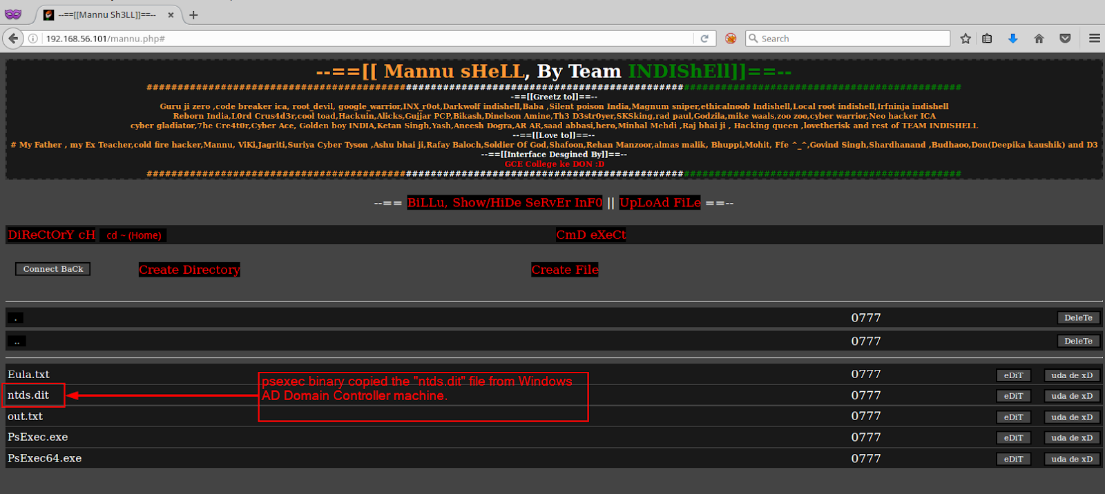 可以看到web shell显示,一个文件已从目标DC机器复制到了我的机器上。让我们确认并检查“C:\xampp\htdocs\box\ps”看看是否已成功复制“ntds.dit”文件。