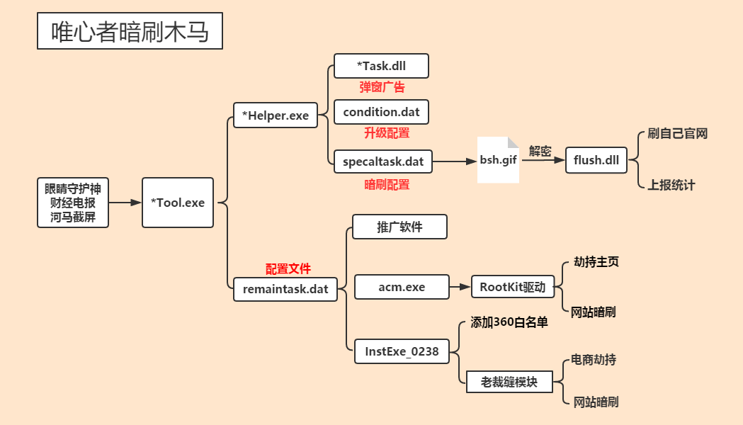 近期,毒霸捕风系统发现“独狼”病毒家族的感染量呈现出上升的趋势,结合数据来看,发现其是从一个名为InstExe_02XX的程序释放而来,在后续的进一步分析中,我们发现多款流氓软件近期同时都在推送该文件,该文件除了会实时从云端服务器接收指令,进行流量暗刷、病毒更新、主页劫持、推广软件的安装等操作外,还会推送安装独狼和老裁缝流量暗刷病毒。