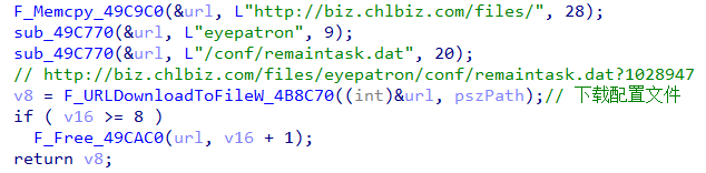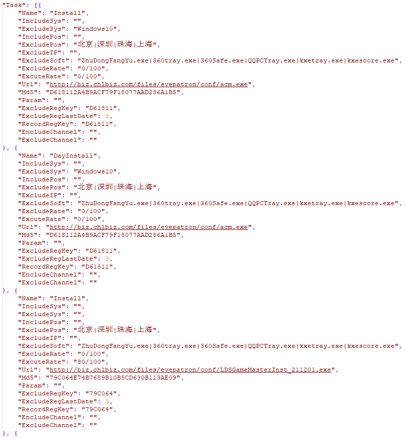 通过检测后,会去下载http://biz.chlbiz.com/files/eyepatron/conf/specaltask.dat文件,该文件解密后内容如下: