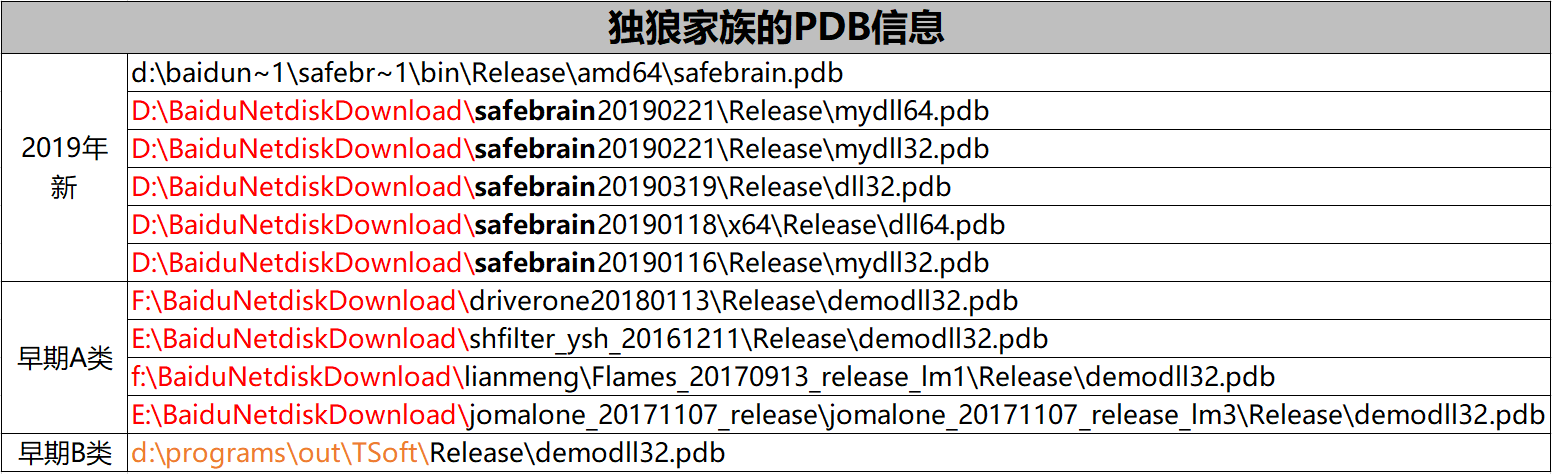 结合驱动文件本身采用的技术手段,并对照驱动文件的PDB的路径信息,种种迹象表明该病毒属于独狼家族,而safebrain则为其2019年的新代号,独狼的分支可以大致分为BaiduNetdiskDownload和TSoft两条线,暂不清楚2条分支之间是什么关系,相关信息如下: