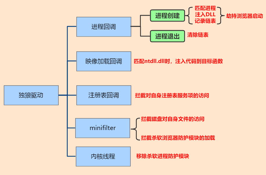 针对特定进程过滤其对指定路径文件的访问,从而阻止浏览器保护相关模块工作,也保护自身不被轻易查杀。