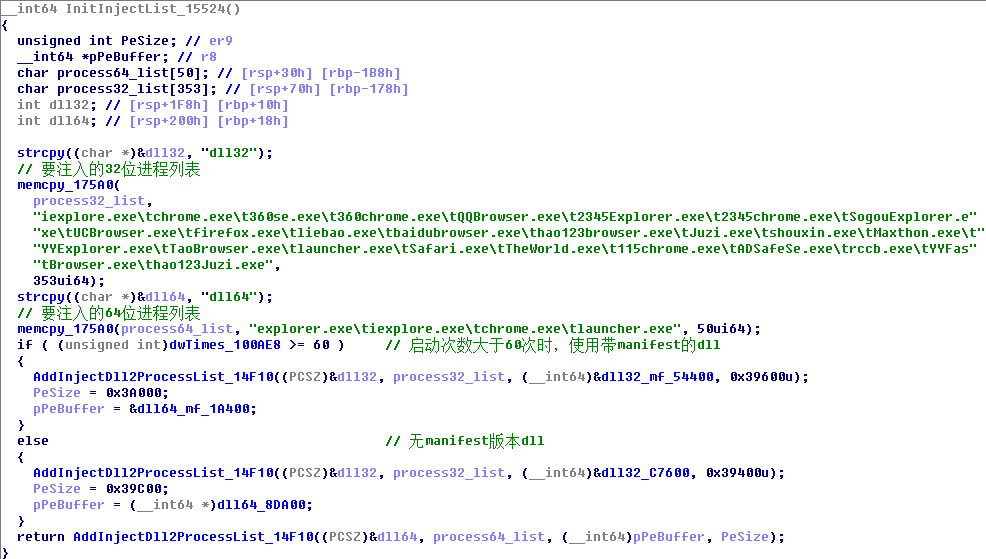 驱动加载后,会获取系统版本信息,并在注册表服务服务项下记录驱动加载次数,然后创建设备“\Device\SafeBrain”,接着初始化要注入的进程和模块信息,针对32位进程和64位进程分别配置注入模块,同时根据驱动的加载次数,选择不同的DLL版本,大于60次时使用带manifest的DLL: