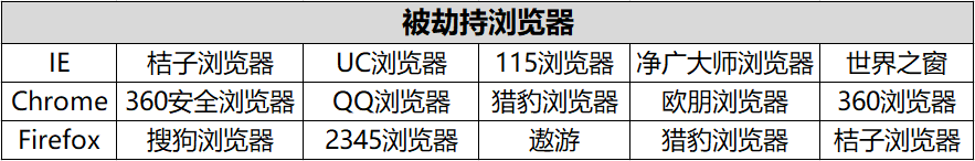 被劫持的浏览器,基本覆盖国内主流的浏览器:
