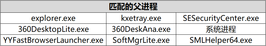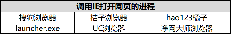 当父进程匹配如下列表时,则从CSIDL_COMMON_APPDATA\\safebrain\\conf.ini中读取url配置作为命令行参数调用CreateProcess打开浏览器进程: