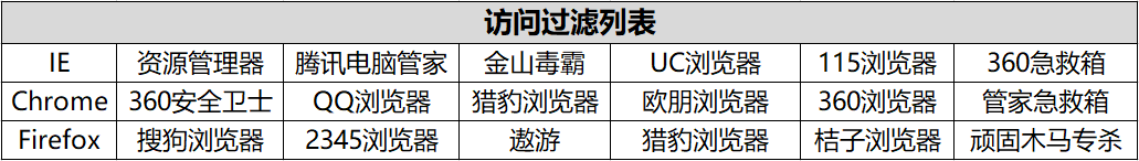 过滤函数针对常见的浏览器进程、杀软进程以及相关的浏览器保护模块都进行了过滤,过滤列表如下: