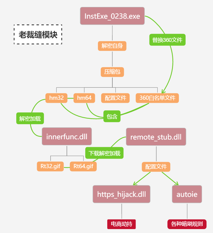 该模块的后续加载文件全部内存加载不会落地,与之前的老裁缝病毒不同的是,这个版本首先会尝试将自身添加至360白名单,接着再层层解密释放老裁缝病毒模块,从而进行后续的电商劫持和流量暗刷操作,不过在360监控、防护正常的时候,并不能够覆盖成功。