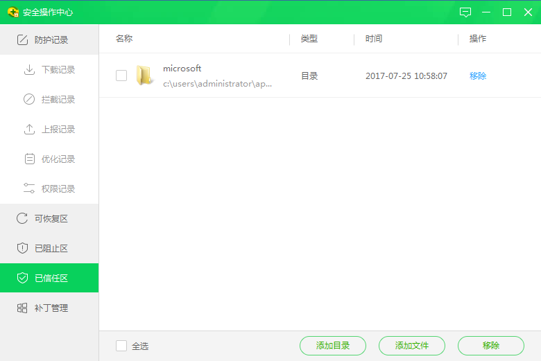 接着将自身释放到上图中选择的目录,最后将360安全卫士目录下的speedmem2.hg(信任区文件替换掉,从而完成信任区的添加替换操作,被成功添加后的信任区如下: