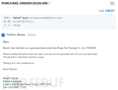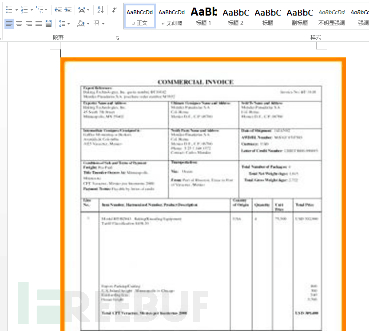 针对该公司攻击时的邮件附件名为:**精密股份限公司_3Q_pdf.doc,可见黑客已经在攻击前搜集了该公司的详细信息。打开文档发现包含一张图片,标题为“commercial invoice”,其含义为商业发票(SCcommercial invoice),是卖方开立的载有货物名称、数量、价格等内容的清单,作为买卖双方交接货物和结算货款的主要单证,是进口国确定征收进口关税的依据,也是买卖双方索赔、理赔的依据。