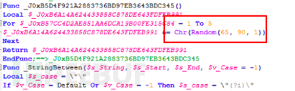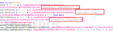 分析“xql=njc”中的脚本代码,发现其功能为从phm.ppt中按照一定的特征如“S3tting”、“Dir3ctory”、“sK”、“sN”、“sData”、“esData”等定位加密数据,将加密数据解密成新的AutoIt代码后,保存至当前目录下的五位随机字符组成的文件名中,然后通过Run命令执行该脚本文件。