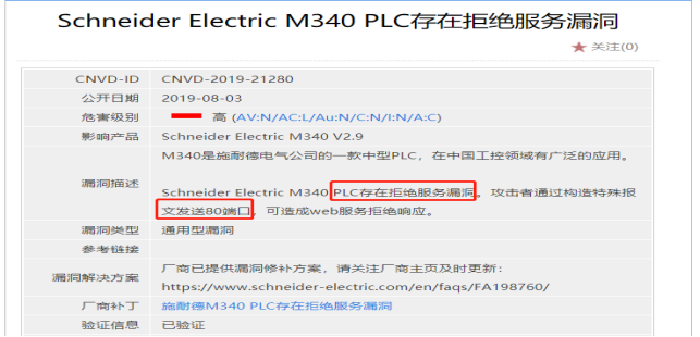 2)黑客对工控网络攻击,首先会利用诸如nmap、masscan等工具利用syn、fin或者ack等方式进行快速端口扫描,识别出重要工业控制资产类型,比如西门子plc(默认102端口)、施耐得plc(默认502端口)等控制设备,接着在进行工控资产识别,识别出plc具体厂商、型号、固件版本等信息。最后结合cnvd等漏洞库对plc发起攻击,比如利用如下漏洞进行plc 拒绝服务攻击。