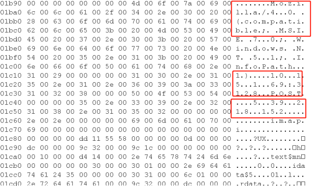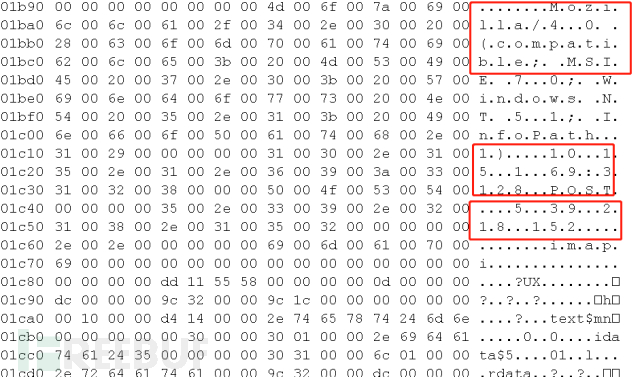 2)利用二进制查看工具对文件内容进行分析,关键内容如下所示