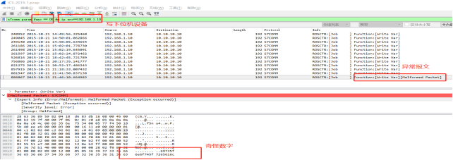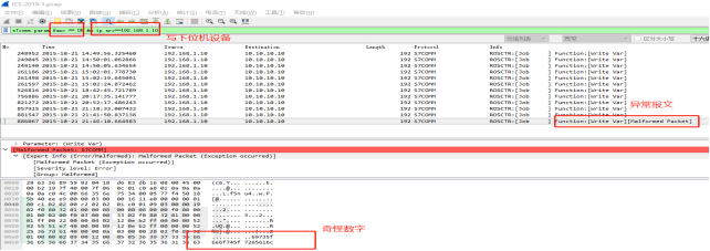 1)首先利用wireshark打开数据包,初步流量数据报文,发现工控流量只有s7common,利用过滤条件过滤出工控流量如下图所示