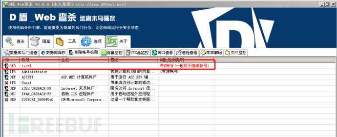 除了上述命令查询外,我们也可以利用D盾来检测一下主机中的异常信息,需要注意的是没有签名验证信息的进程、没有描述信息的进程、进程的属主、进程的路径是否合法CPU或内存资源占用长时间过高的进程等方面。提示一下,D盾是需要在联网的状态下进行的。一般管理员建立临时账号是不会建立隐藏账号的,所以一旦查出来有隐藏账号,那么就顺藤摸瓜查一下这个账户的操作日志(日志完好的情况下,这里重点提示了不仅主机要开启日志记录的功能,还要有日志审计服务器)。