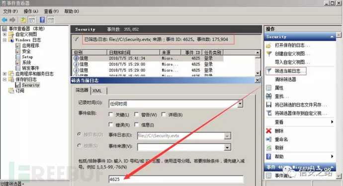 我们输入事件ID:4625进行日志筛选,发现事件ID:4625,事件数175904,即用户登录失败了175904次,那么这台服务器管理员账号可能遭遇了暴力猜解。