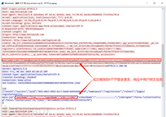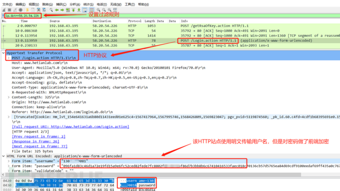 在WireShark中设置过滤规则“ip.dst==58.20.54.226”,发现登录请求传输的账号密码信息: