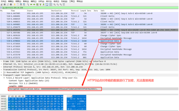 看完上面HTTP站点的数据在WireShark中“裸奔”,接下来看看HTTPS站点是不是也如此。