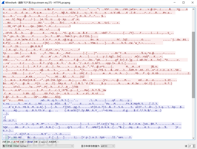 继续选择任意协议为TLSv1的流量后右击选择追踪流->TCP流,发现数据均经过加密,根本看不懂: