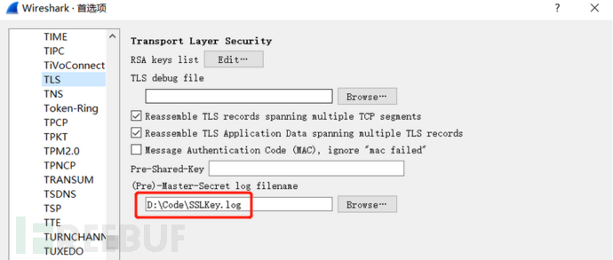 3、现在可以将密钥导入到Wireshark了,具体路径如下:菜单栏—>编辑—>首选项—>Protocols—>TLS/SSL(选择SSL还是TLS请根据实际情况):