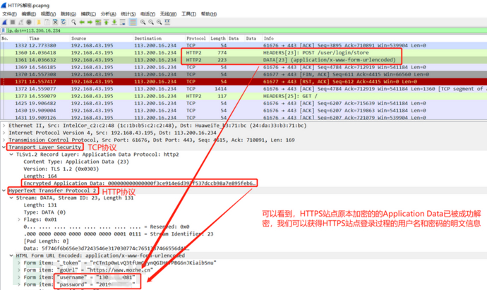 (2) 但是如果使用WireShare来单纯监听、嗅探HTTPS协议的数据包的话,我们就会看到TCP携带的Data都是密文,是无法拿到明文数据的。