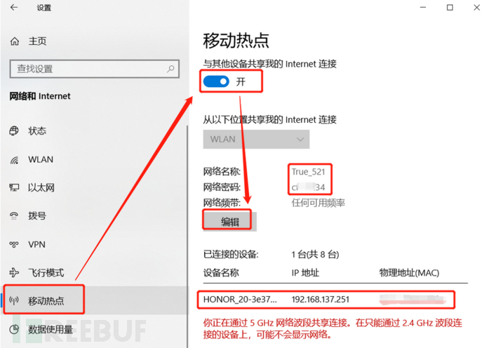 2、移动热点即变为可开启状态,并点击编辑按钮进行SSID无线名称及连接密码进行设置即可: