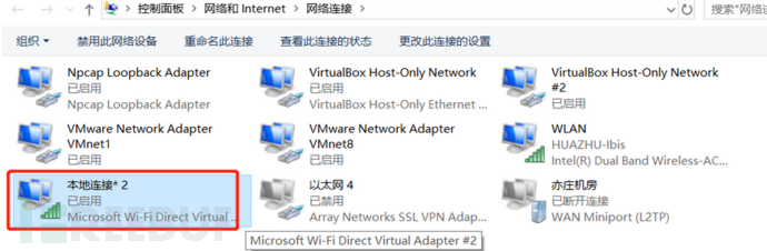 3、在网络连接设置页面上找到刚刚开启的虚拟AP网卡信息: