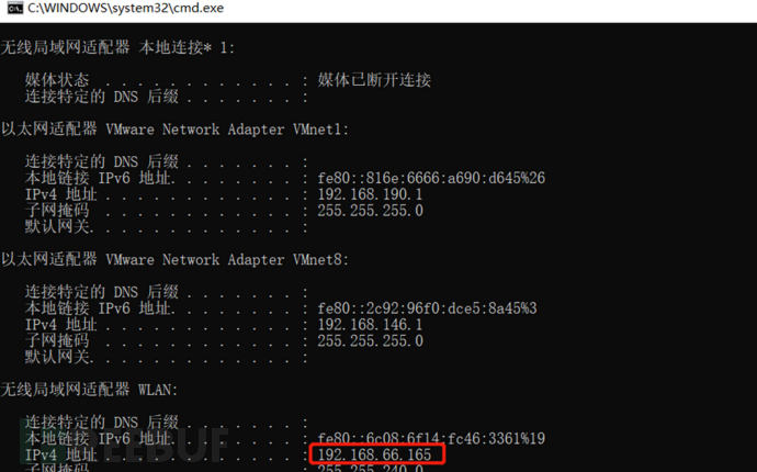 4、在CMD窗口中使用ipconfig命令查询当前主机的IP,结果为: