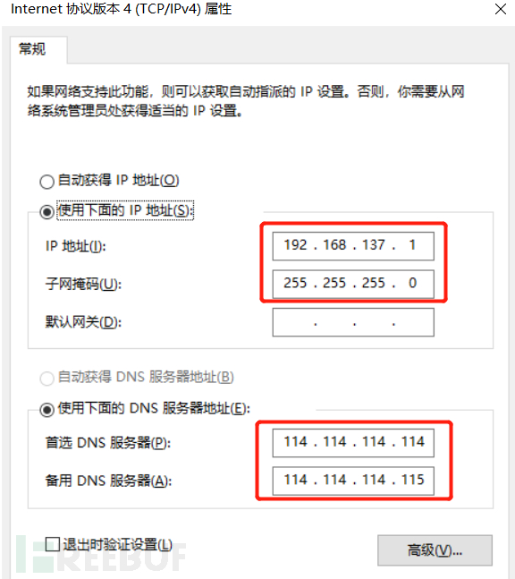 5、设置虚拟网卡的IP地址、子网掩码、DNS服务器地址如下,点击确认: