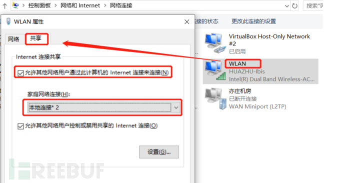 6、选择WLAN 右键属性—>共享设置,选择共享并选择刚刚开启的无线AP热点,点击确认:
