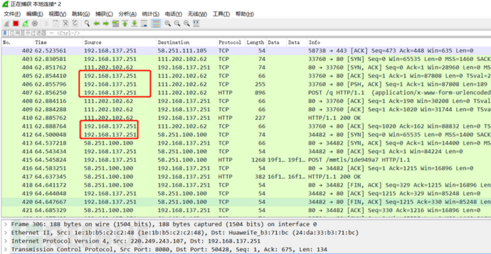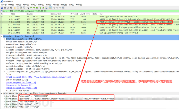 12、在WireShark输入过滤规则“ip.src==192.168.137.251 and ip.dst==58.20.54.226”并查看登录请求包,成功监听到明文账号和密码信息(已做前端加密):