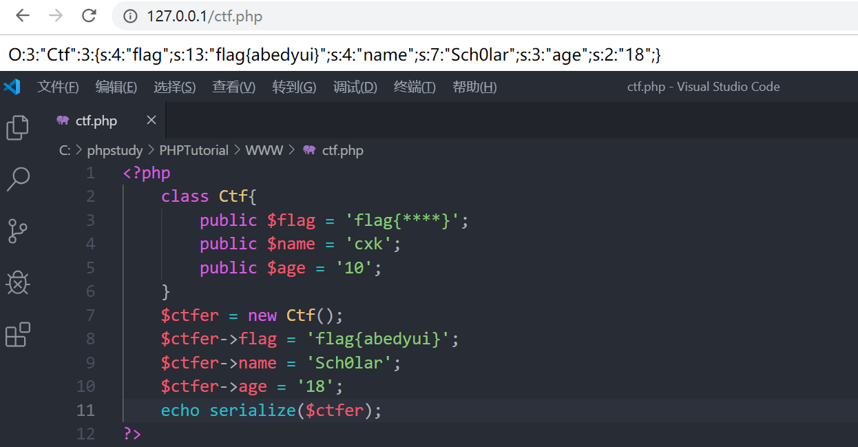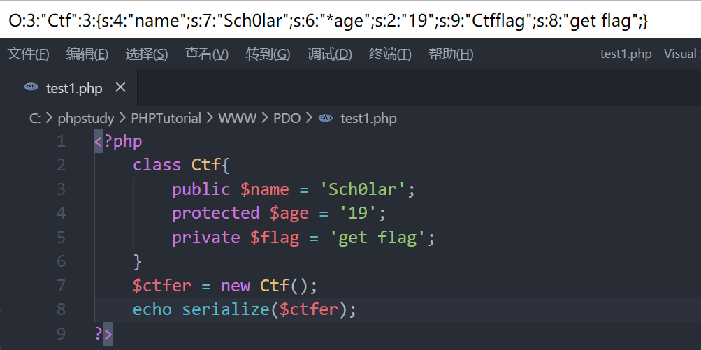 O:3:"Ctf":3:{s:4:"name";s:7:"Sch0lar";s:6:"*age";s:2:"19";s:9:"Ctfflag";s:8:"get flag";}
