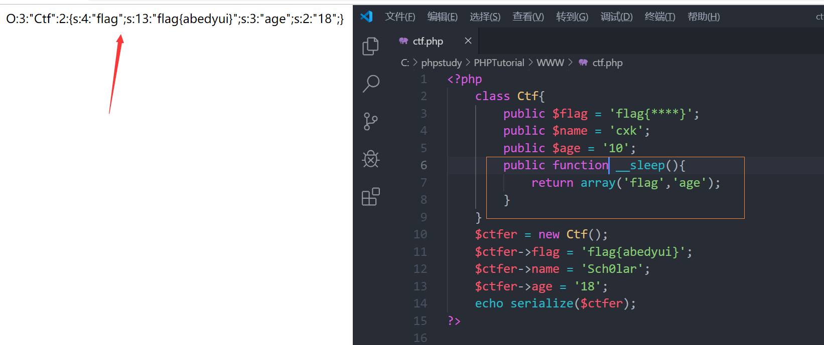 上图__sleep()方法使flag age 属性序列化 name并没有被序列化