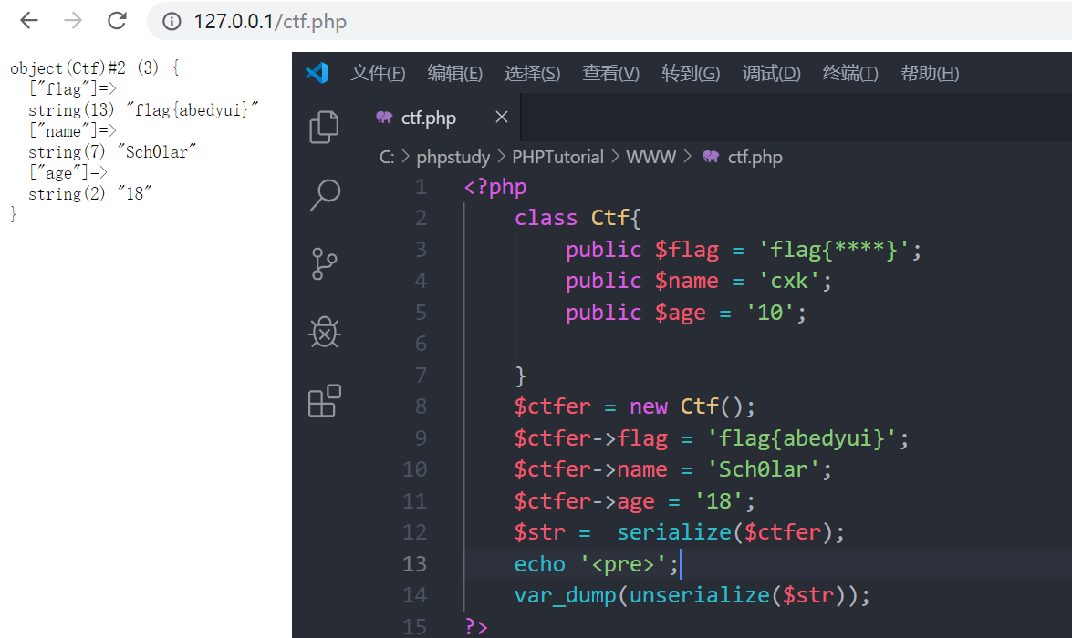首先我创一个Ctf类 里面写了三个属性 后创建了一个ctfer对象 将Ctf类里的信息进行了改变。如果后面还要用到这个对象,就可以先将这个对象进行实例化。用的时候在反序列化出来就ok了