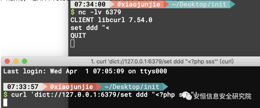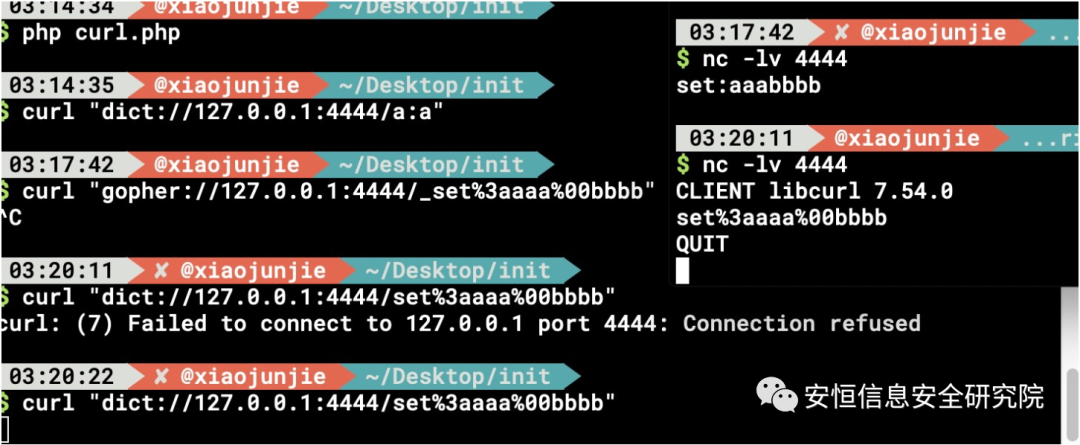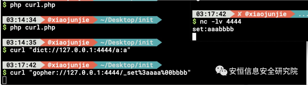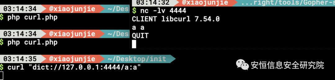 通过nc 对比gopher和dict协议后发现,dict会自动加上quit命令 XD