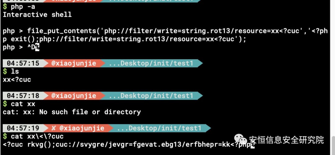 php://filter/write=string.rot13/resource=xx<?php使用的rot13反转,虽然绕过了exit();但是会导致输出文件出现<?cur 如下图所示