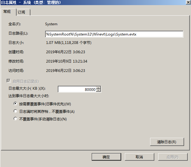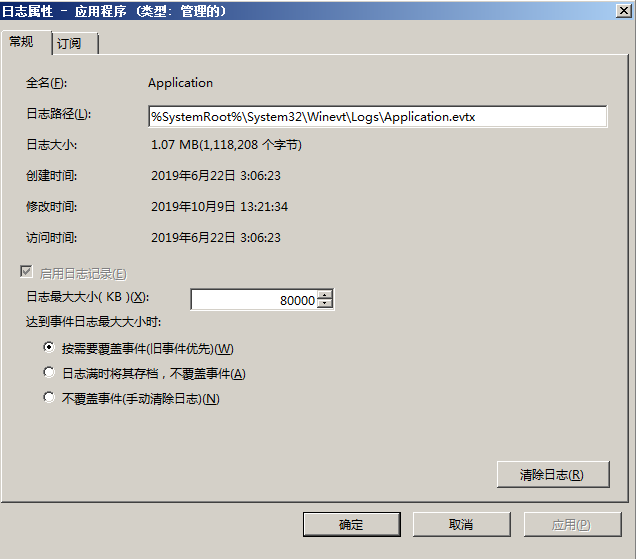 | 应用程序 | 80000KB | 覆盖早于 30 天的日志 |