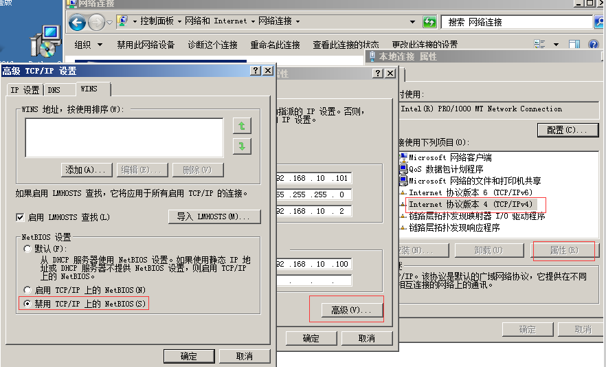 右键“网络”,单击“属性”,在点击“更改适配器设置”,打开本地连接的“属性”,选中Interne协议版本4(tcp/ip),常规选项卡---高级,设置WINS选项卡“禁用TCP/IP上的NETBIOS"