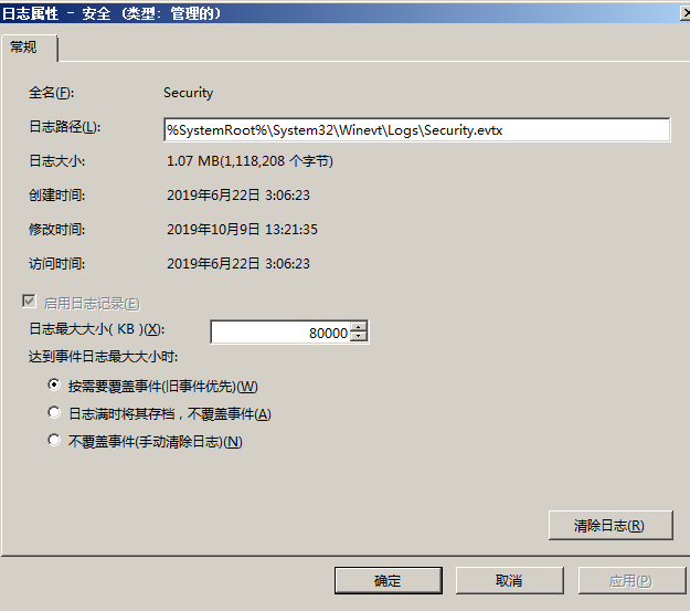 | 安全日志 | 80000 KB | 覆盖早于 30 天的日志 |