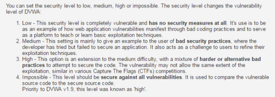 需要注意的是,DVWA 1.9的代码分为四种安全级别:Low,Medium,High,Impossible。初学者可以通过比较四种级别的代码,接触到一些PHP代码审计的内容。