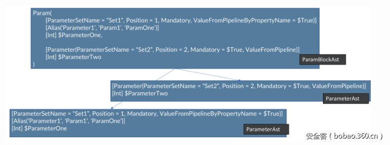 可以看到,大一点的ParamBlockAst中包含两个参数。目前为止,我们关注的是ParameterOne这个参数。现在,我们可以将前面用到的混淆技巧用到这个参数上。